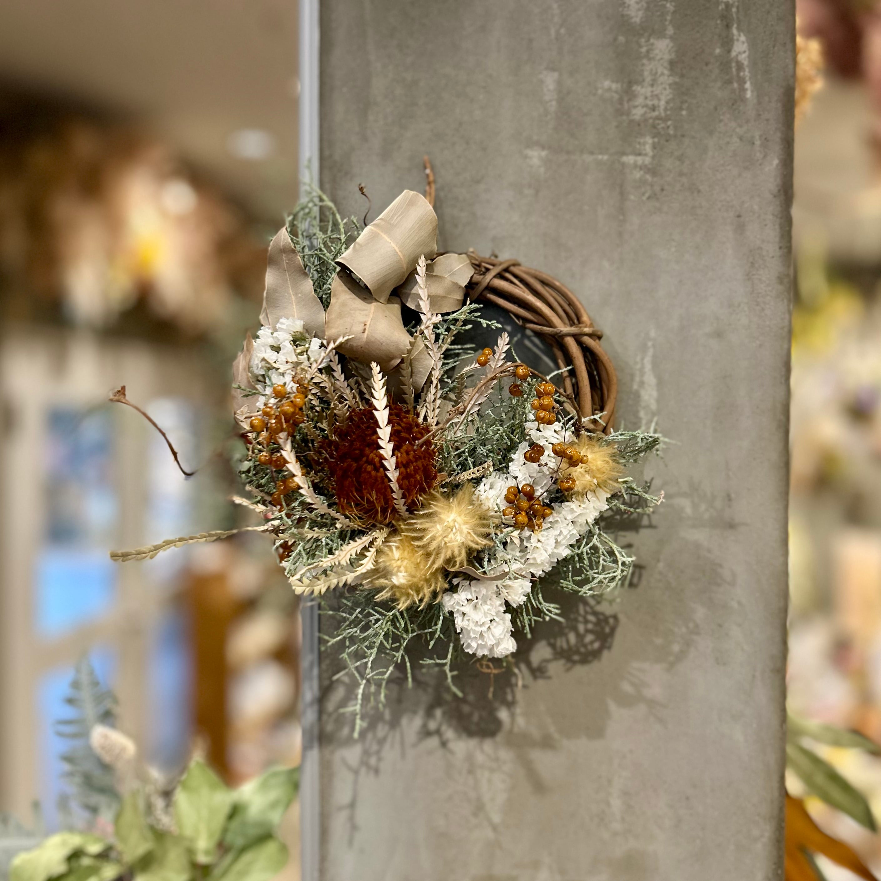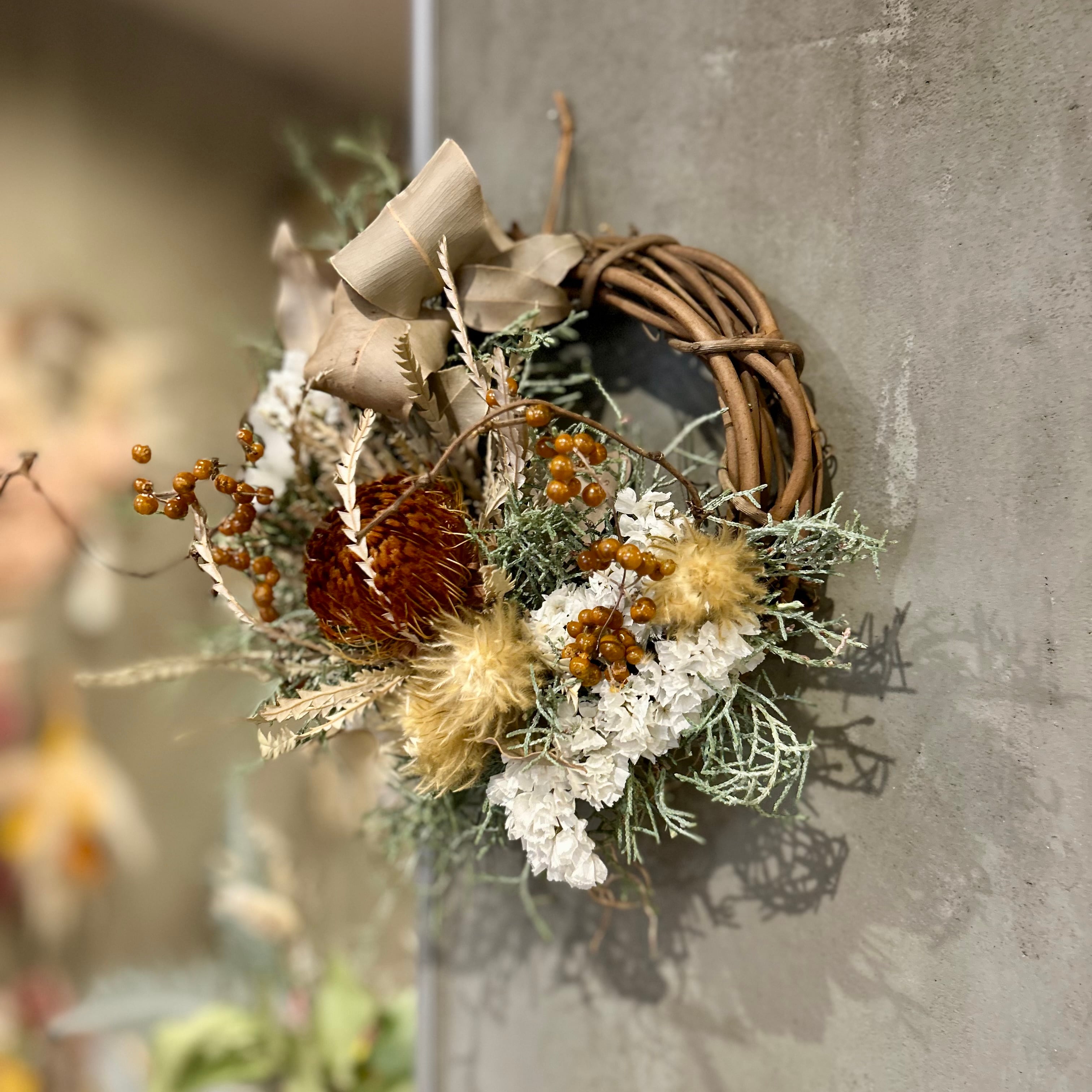 ■花 材:ドライアンドラ、スターチス、フィリカなど