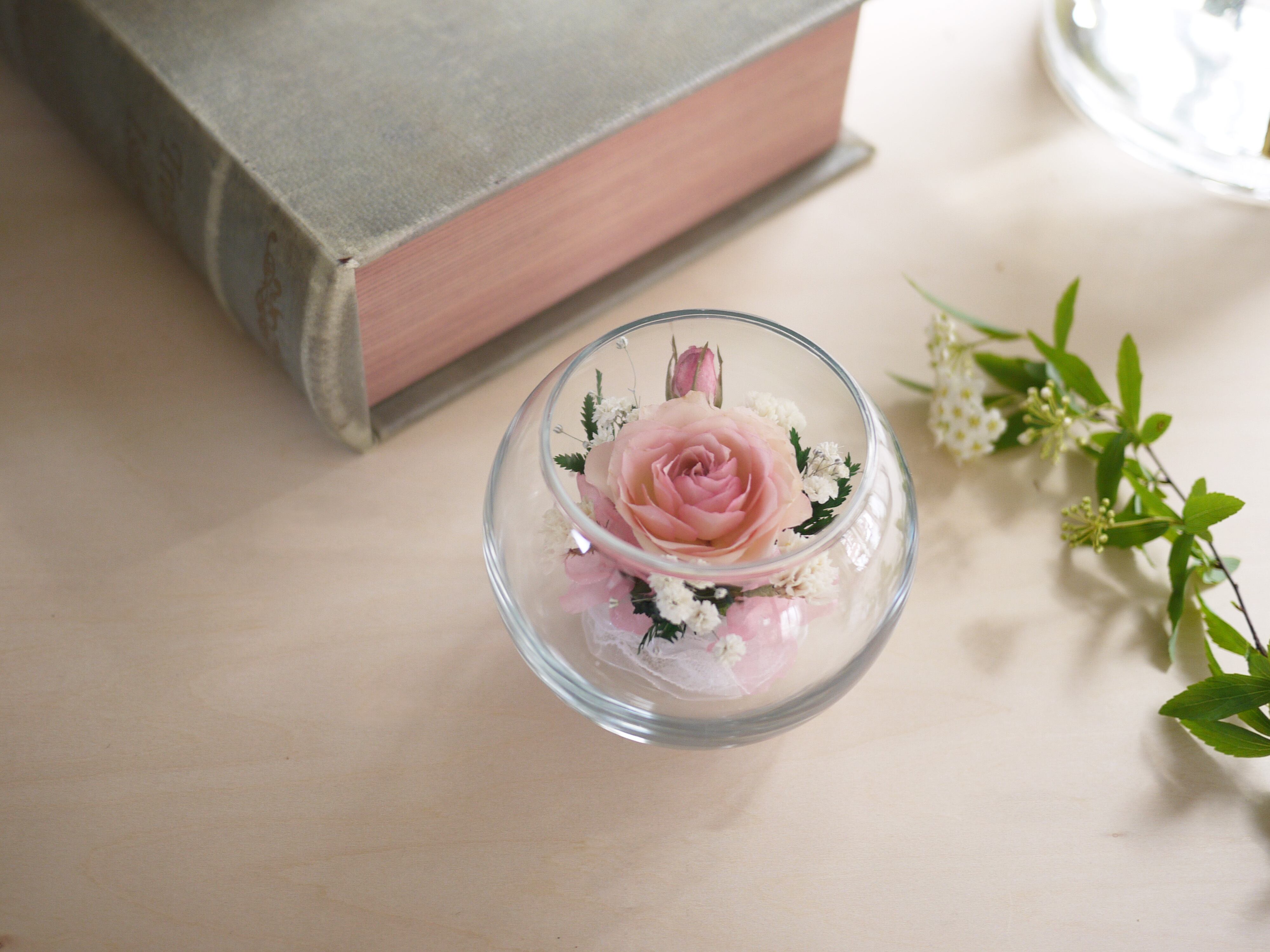 新鮮な花を乾燥し、ガラスの中に閉じ込めたインテリア商品、ボトルフラワー。