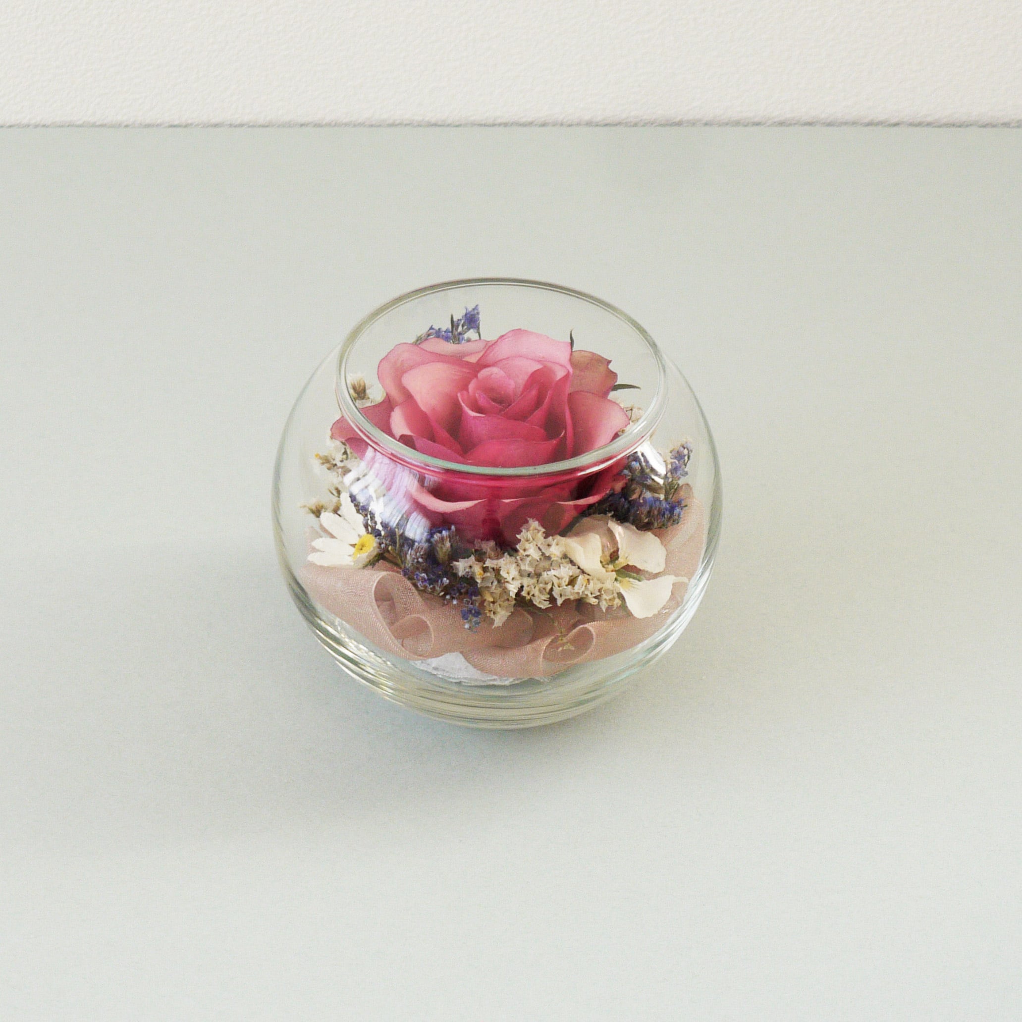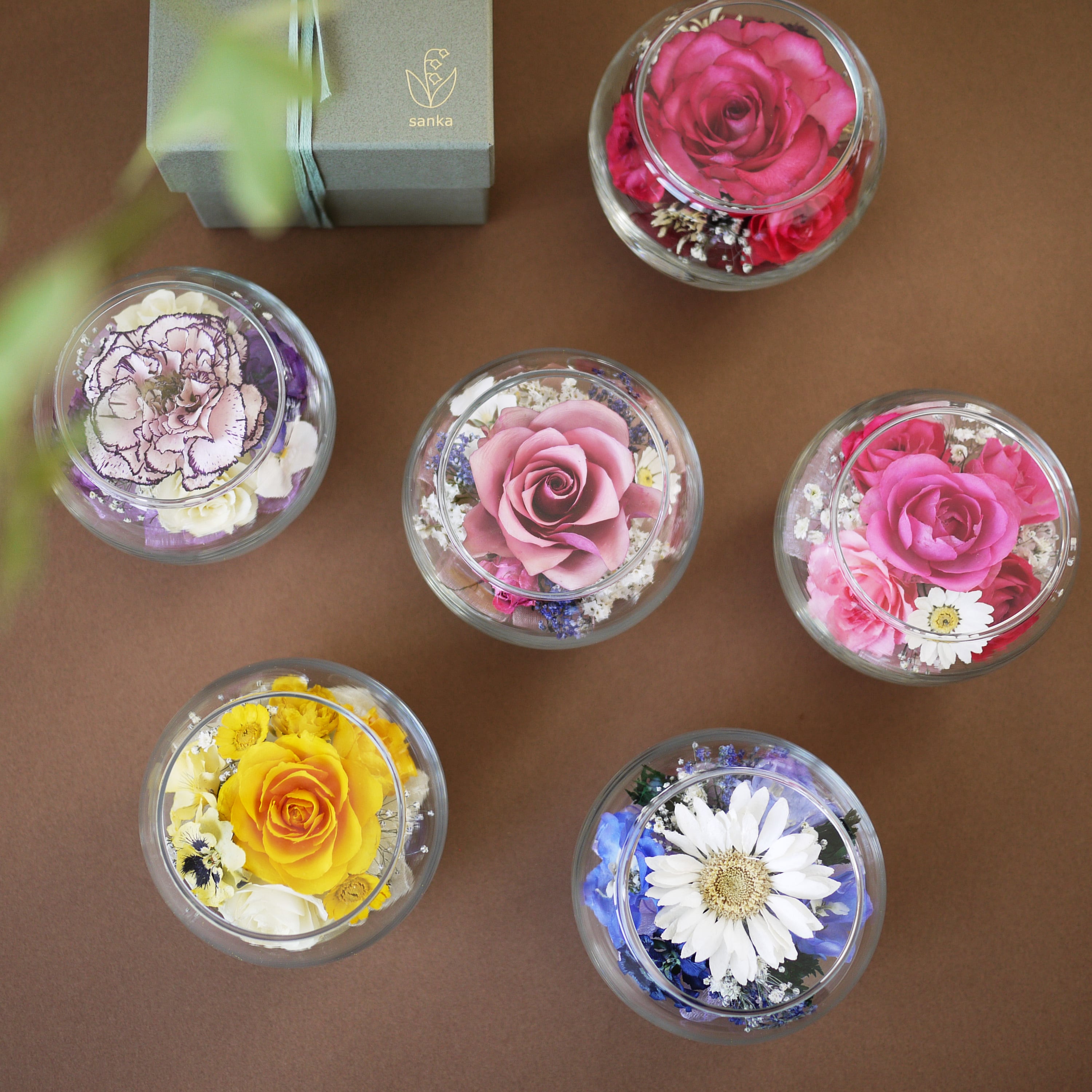 花材を一つずつ丁寧に乾燥加工し仕上げられています。長い間保つことができるため、お部屋のインテリアとしても最適です。